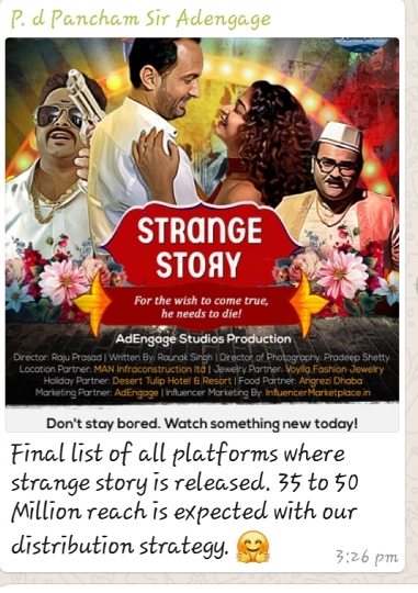 हंगामा प्ले एप पर रिलीज़ हुई वेब सीरीज “स्ट्रेंज स्टोरी” मेे रत्नेश बरनवाल ने लीड विलेन का रोल प्ले किया है। इसके प्रोड्युसर पंचम सर हैं। यह वेब सीरीज पांच पार्ट्स मेे है, जिसमे से 3 और 4 पार्ट में उनका अहम काम है। आपको बता दें कि इसके ऑन लाइन रिलीज़ होने के 3 दिनों में ही इसको 50 मिलियन व्यूज मिल चुके हैं। रत्नेश बरनवाल बेहद उत्साहित होकर कहते हैं “मैं प्रोड्युसर पंचम सर और चैनल वालों को लाख लाख धन्यवाद देना चाहूंगा कि उन्होंने मुझे इस अनोखी वेब सीरीज का हिस्सा बनाया।”