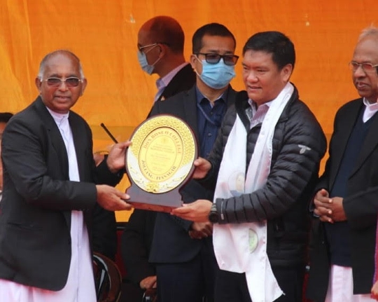 The Chief Minister of Arunachal Pradesh, Sri Pema Khandu, felicitating Fr C C Jose of Don Bosco College at the inauguration of Don Bosco Stadium.
