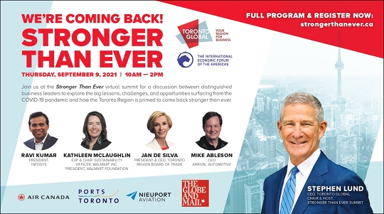 Toronto, ON – September 6, 2021 – Toronto Global and the International Economic Forum of the Americas announced that on September 9, 2021, they will co-host a global business summit to celebrate the re-opening of the Canadian and global economies.