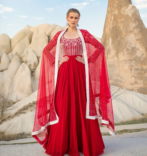 The garments are ornate with extension of their statement rose gold, white sequins, intricate zari, and perfectly matched beads to give each piece a modern and sophisticated characteristic combined with geometric, symmetrical and floral pattern combinations. The vibrant hues, hot pink, persian blue, bridal red and mahogany encapsulated in silhouettes which are constructed and tailored to give you one of a kind experience of the monarchical era, with select and pure silk, panelled lehengas, constructive jackets, draped anarkali, corsets, classic drapes and tulles resulting in a royal and charming look you can wear to the occasions that are close to your heart!