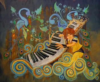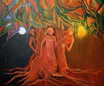 Aparna paints to spread positive message in this world. Aparna’s collection titled “ Melodies of Nature “, is a beautiful amalgamation of nature, emotions and the divine. Her paintings start off with youthful shapes and colours and transform into a novel of thoughts. Her creative paintings and photo realistic pictures stand out for their size and quality. . Aparna orchestrates multiple figures and forms from nature, on the canvas, to give birth to another larger forms with underlying concepts. Her unique arrangements of human and natural elements mutate into mesmerizing treat for the eyes. One truly feels the need to keep revisiting her paintings, only to obtain a different perspective each time.