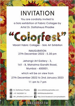 A solo art exhibition of vibrant fabric collages by contemporary artist Dr.Dattatreya Phadke is showing in Jehangir Art Gallery, M.G. Road, Kala Ghoda, Mumbai 400 001 from 27th December, 2022 to 2nd January, 2023 between 11 am. to 7 pm.