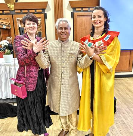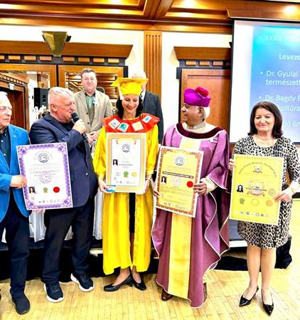 H.E. Amb. Dr. Anna Hevesi, celebrated for her contributions to peace through dance, music, art, and culture, was honored by Prof. Dr. Krishan with a Doctorate Degree (Honoris Causa) and the Human Excellence Platinum Award. Her efforts in promoting peace culture across Albania, the Balkans, Europe, India, and globally have long been mentored under AUGP USA.